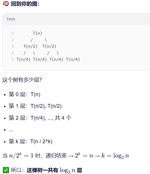 - 总时间 = 层数 × 每层代价 = log2n×n=O(nlogn)
