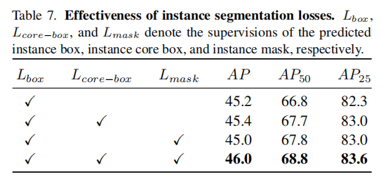 表 7 验证了实例分割损失中各部分的作用,其中表示对预测实例框的监督损失,