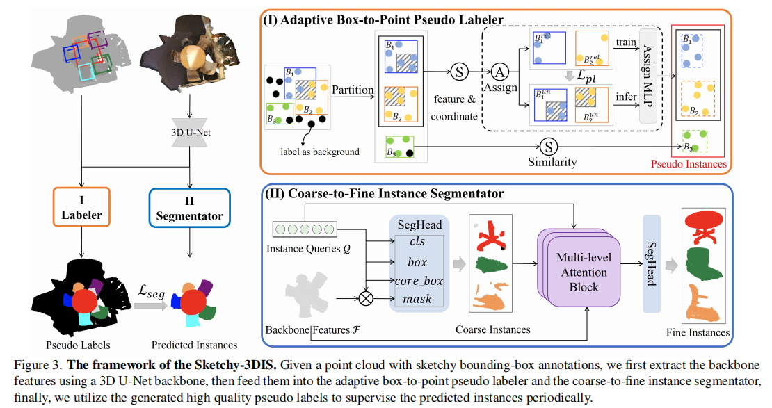图 3. Sketchy-3DIS 的框架。给定带有草图边界框标注的点云,首先通过 3D U-Net 骨干网络提取特征,然后将特征分别输入自适应框到点伪标签生成器和粗到精实例分割器,最后利用生成的高质量伪标签定期监督预测的实例,实现模型的联合训练。