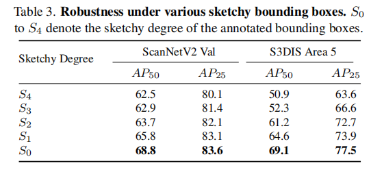 表 3 展示了 Sketchy-3DIS 在四种不同草图程度的边界框(S1 到 S4)监督下的性能,其中 S0 为准确边界框。可以看出,随着草图程度的增加(从 S1 到 S4),模型的性能仅轻微下降。在 ScanNetV2 验证集上,S4 的 AP50 为 62.5,相比 S0 的 68.8 仅下降 6.3 个百分点;在 S3DIS Area 5 上,S4 的 AP50 为 50.9,相比 S0 的 69.1 下降 18.2 个百分点,但依然保持了较高的性能。这表明 Sketchy-3DIS 对边界框的不准确具有较强的鲁棒性。