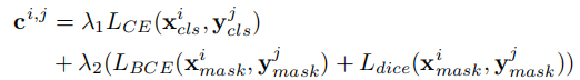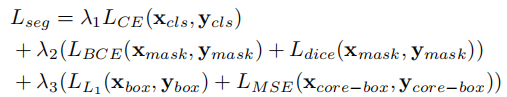 其中实例分割损失不仅监督预测的语义类别和二进制掩码,还监督预测的边界框和核心框,具体定义如下: