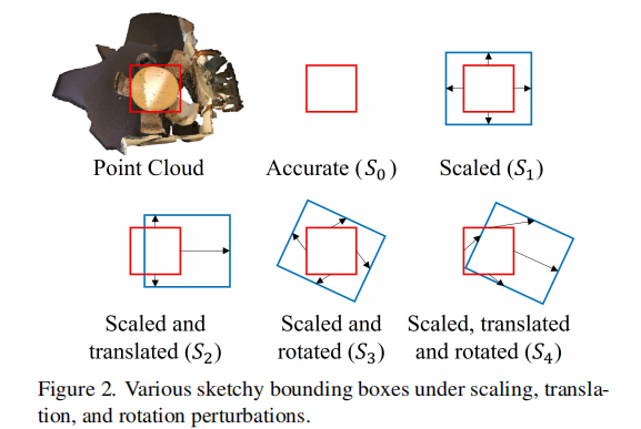 通过组合上述基本扰动操作,生成多种类型的草图边界框。如图 2 所示,展示了四种草图边界框(到