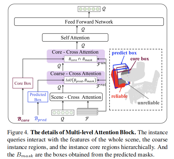 假设一个场景包含 q 个物体,每个查询向量(instance query)代表一个物体,建模实例相关的特征(语义类别和掩码)。查询向量首先与整个点云的骨干特征进行交互,得到粗实例。由于粗实例的逐点掩码无法整体且精确地描述物体,因此进一步预测两个边界框:粗粒度边界框和细粒度边界框,结合场景级特征,通过多级注意力块(Multi-level Attention Block)对初始粗实例进行细化。