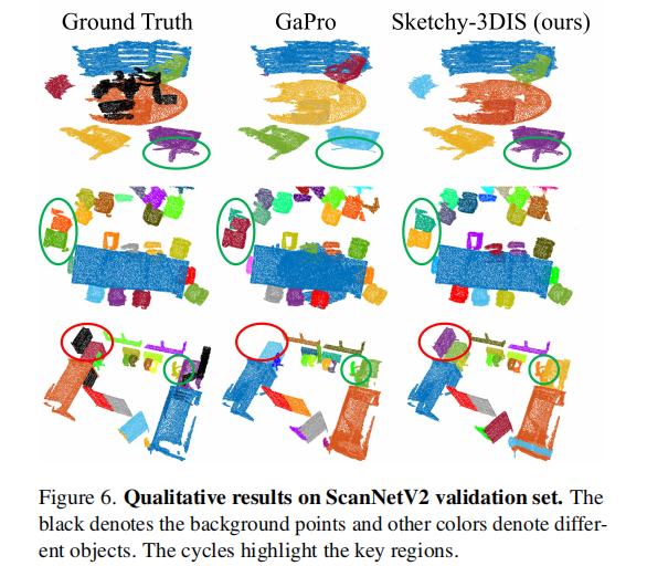图 6. ScanNetV2 验证集上的定性结果。黑色表示背景点,其他颜色表示不同的物体。圆圈标注了关键区域。