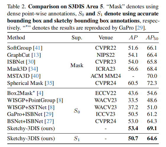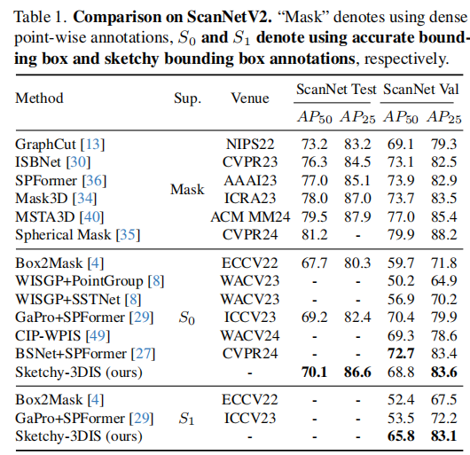 表 1 展示了 Sketchy-3DIS 与现有主流方法在 ScanNetV2 数据集上的性能对比。其中 "Mask" 表示使用密集点级标注的全监督方法,"S0" 表示使用准确边界框标注的弱监督方法,"S1" 表示使用草图边界框标注的弱监督方法。