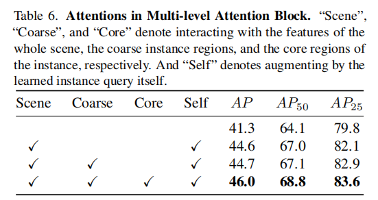 表 6 验证了多级注意力块中各注意力模块的作用,其中 "Scene" 表示与整个场景的特征交互,"Coarse" 表示与粗实例区域的特征交互,"Core" 表示与实例核心区域的特征交互,"Self" 表示通过自注意力模块增强实例查询。