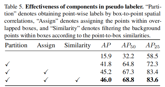 表 5 验证了伪标签生成器中各组件的作用,其中 "Partition" 表示通过框到点的空间相关性获取逐点标签,"Assign" 表示对重叠框内的点进行分配,"Similarity" 表示根据点到框的相似度过滤框内的背景点。