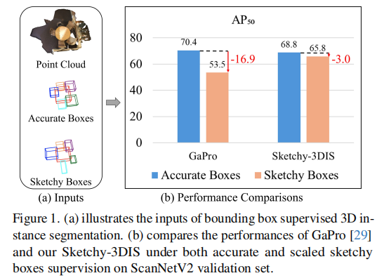 图 1. (a) 展示了边界框监督的 3D 实例分割的输入;(b) 对比了 GaPro [29] 和本文提出的 Sketchy-3DIS 在 ScanNetV2 验证集上,分别在准确边界框和缩放草图边界框监督下的性能。