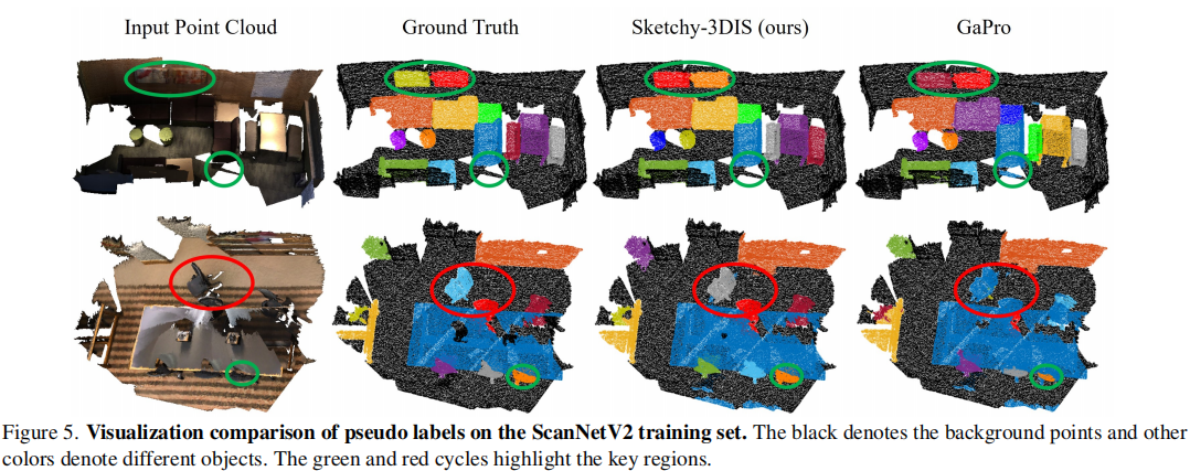 图 5 展示了 Sketchy-3DIS 与 GaPro 在 S1 草图边界框监督下生成的伪标签质量对比。可以看出,Sketchy-3DIS 生成的伪标签在细节上(绿色圆圈标注区域)比 GaPro 更准确,并且能更好地区分同类别的不同物体(红色圆圈标注区域)。与真实标签相比,Sketchy-3DIS 生成的伪标签质量也具有很强的竞争力。