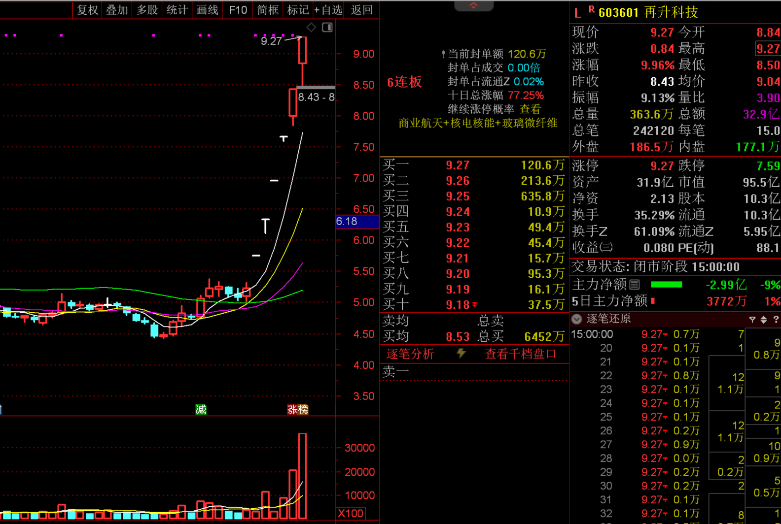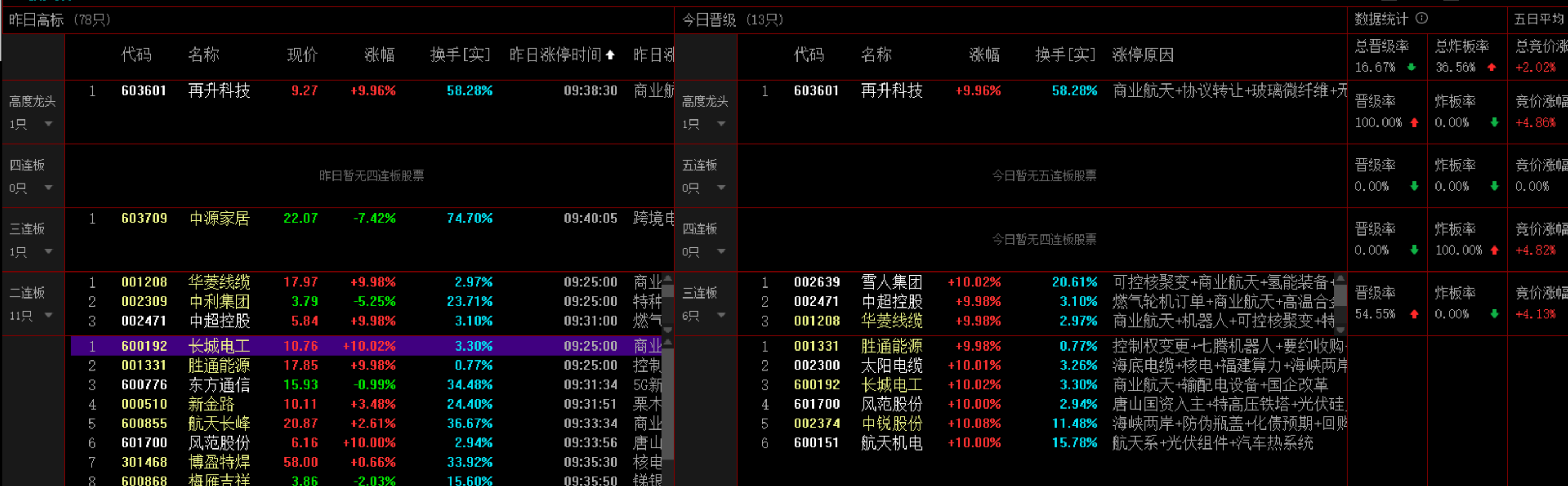 答:今天最强是 商业航天,板块龙头:再升科技 容量是:航天电子