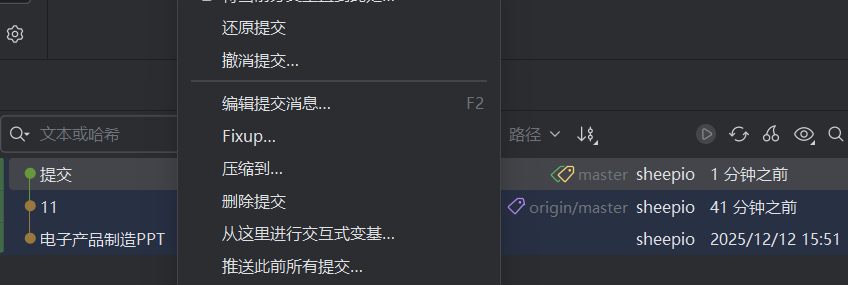 如果你想撤回上次提交,主菜单->Git->显示Git日志。绿色表示该文件提交到本地,黄色表示推送,蓝色表示删除。右击就可以撤消提交。