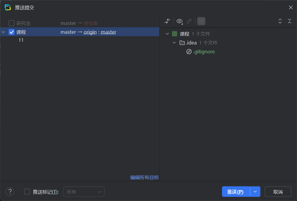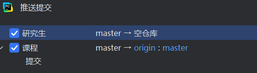 添加之后,就可以在更改中选择要提交的文件,填写提交消息,然后提交(到本地仓库)并推送(到远程仓库)。推送页面如下。