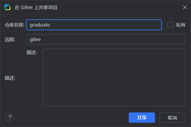 这里通过"在Gitee上共享项目"可以创建一个远程仓库(前提是已经绑定了gitee账号)