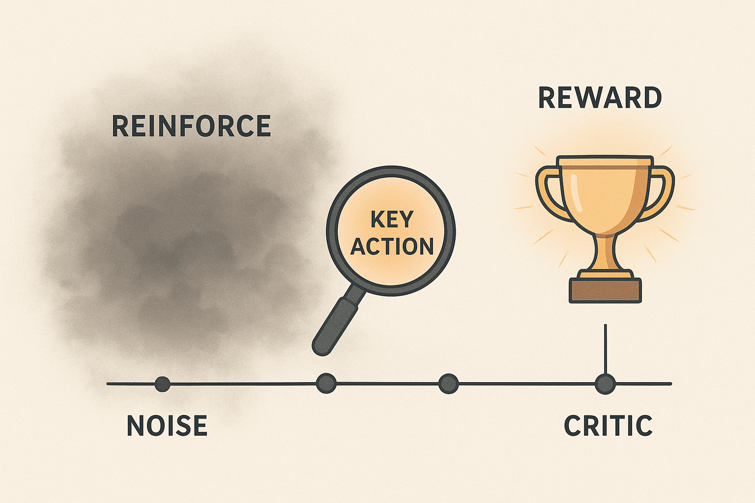 正如刚才的迷宫例子,如果最后赢了,REINFORCE 会倾向于奖励路径上的每一个动作。但在 100 步中,可能只有第 50 步的关键转弯决定了胜利,其他的 99 步都是在甚至可能是在"划水"或者"帮倒忙"。