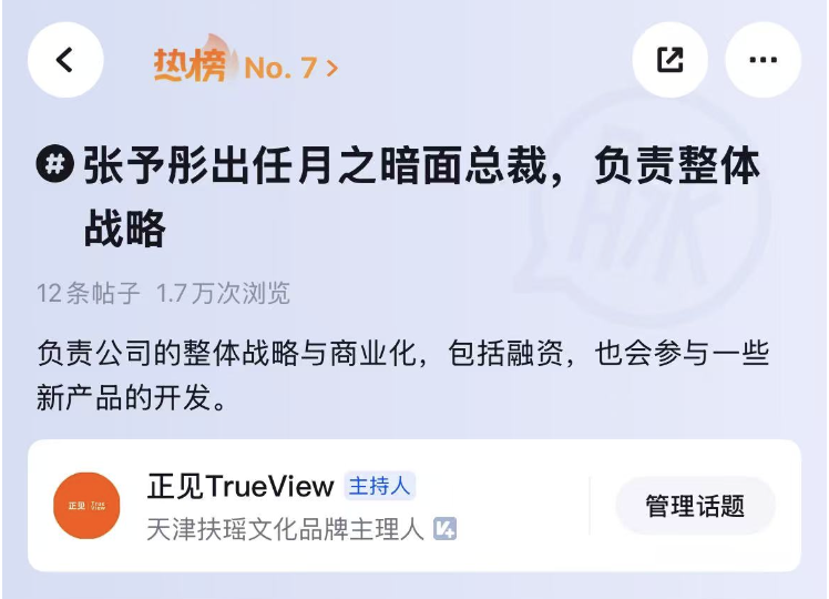 张予彤出任月之暗面总裁,负责整体战略