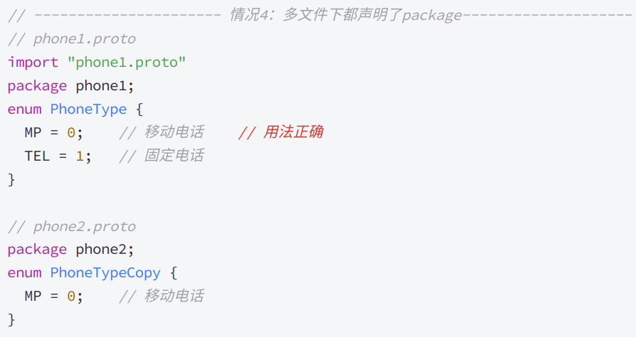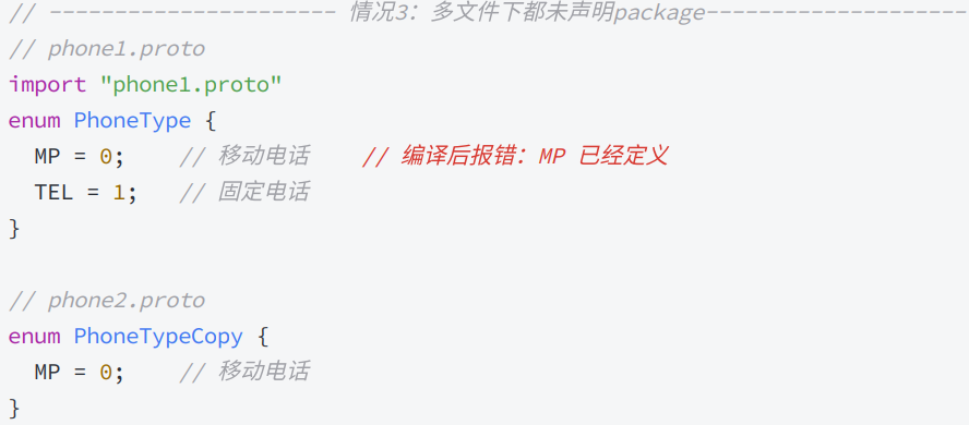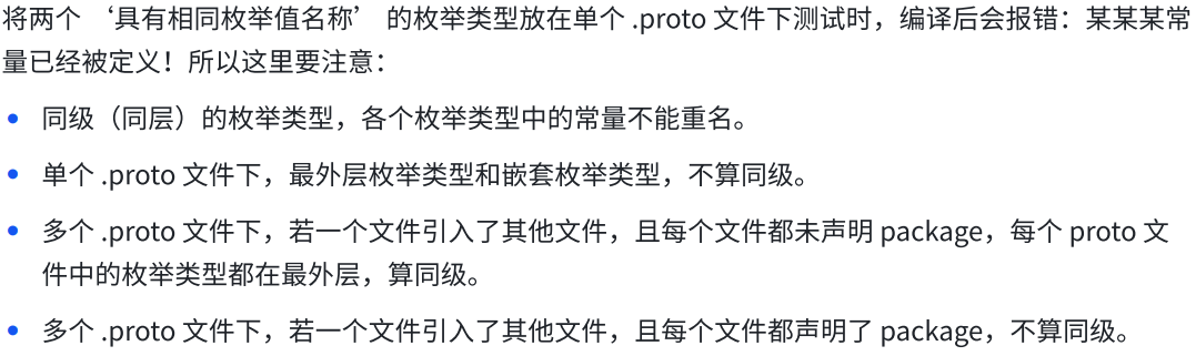 在不同的.proto文件中,也不可以有同名的枚举名字,但是如果加上了package还是可以同名的