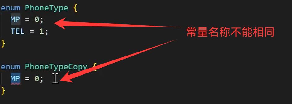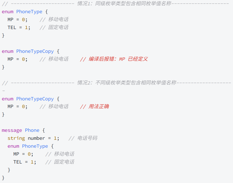 在同一个.proto文件中,不能有同名的枚举名字,但是枚举值可以一样