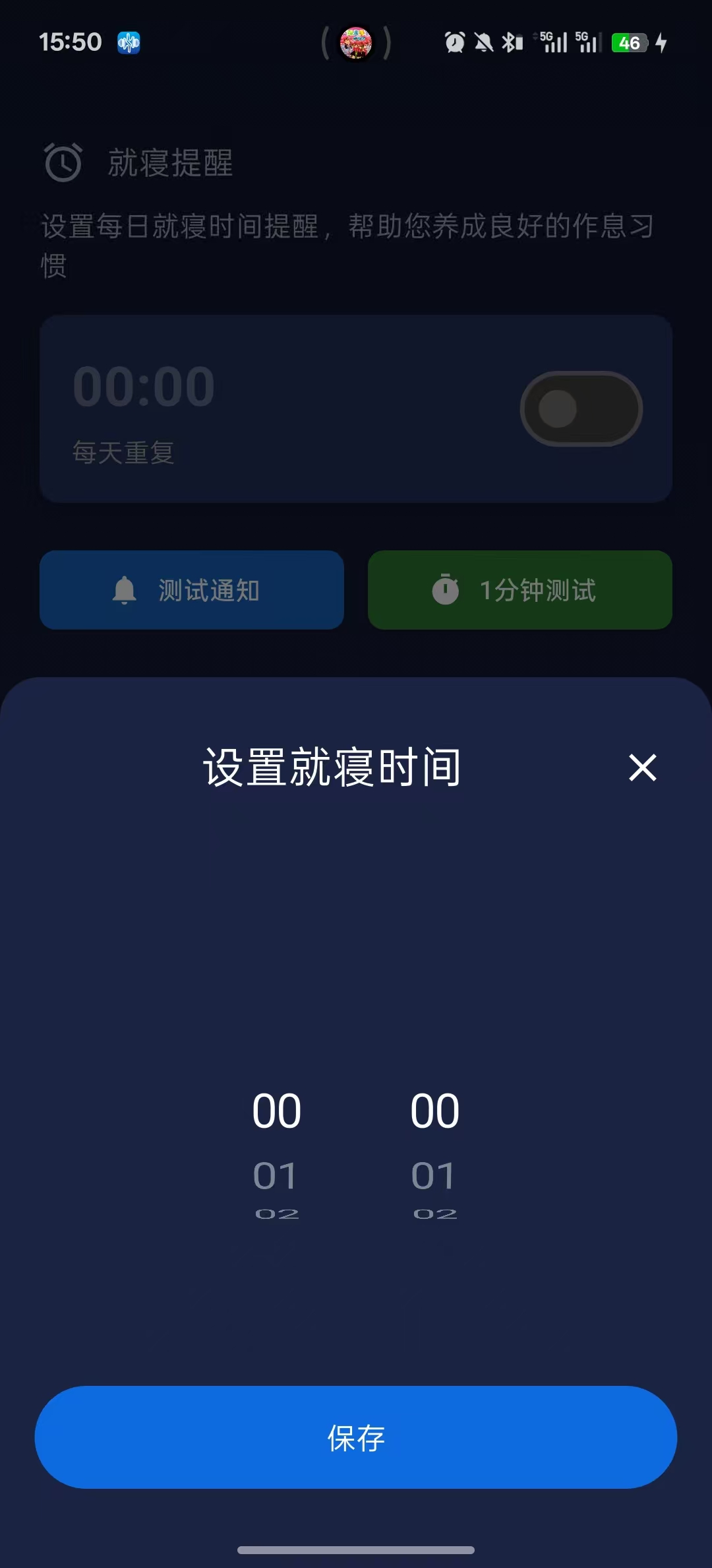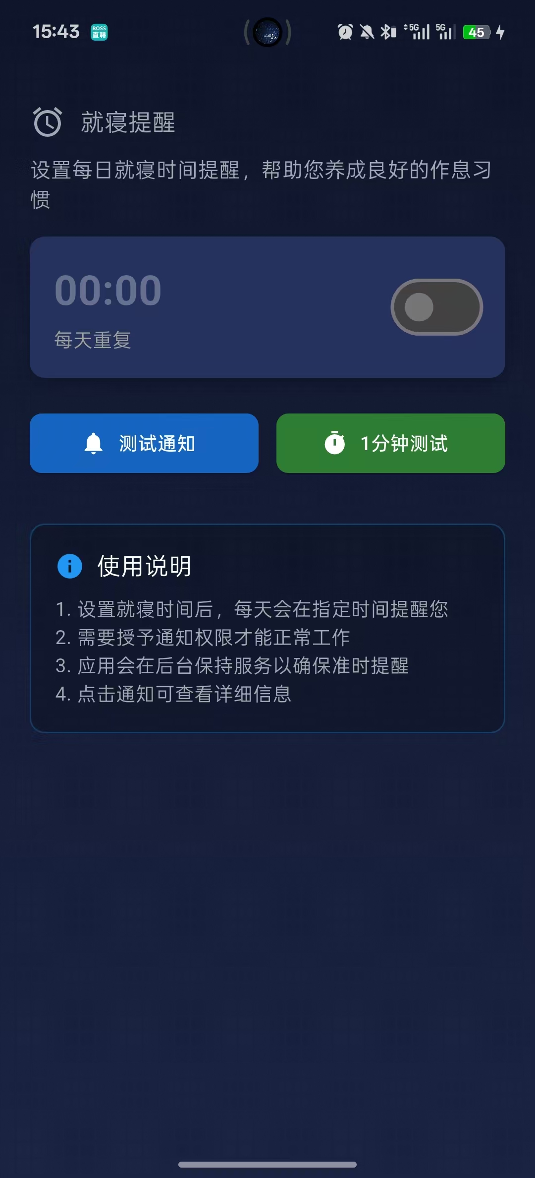这是一个就寝提醒的闹钟通知,根据用户设置的时间,到了时间点就弹出通知,测试通知按钮是测试通知是否可行,一点击按钮就一个弹出一个测试通知。一分钟测试也是测试通知的效果,是根据当前的时间,再加上一分钟,然后设置闹钟通知,用户可以在一分钟后看到通知。