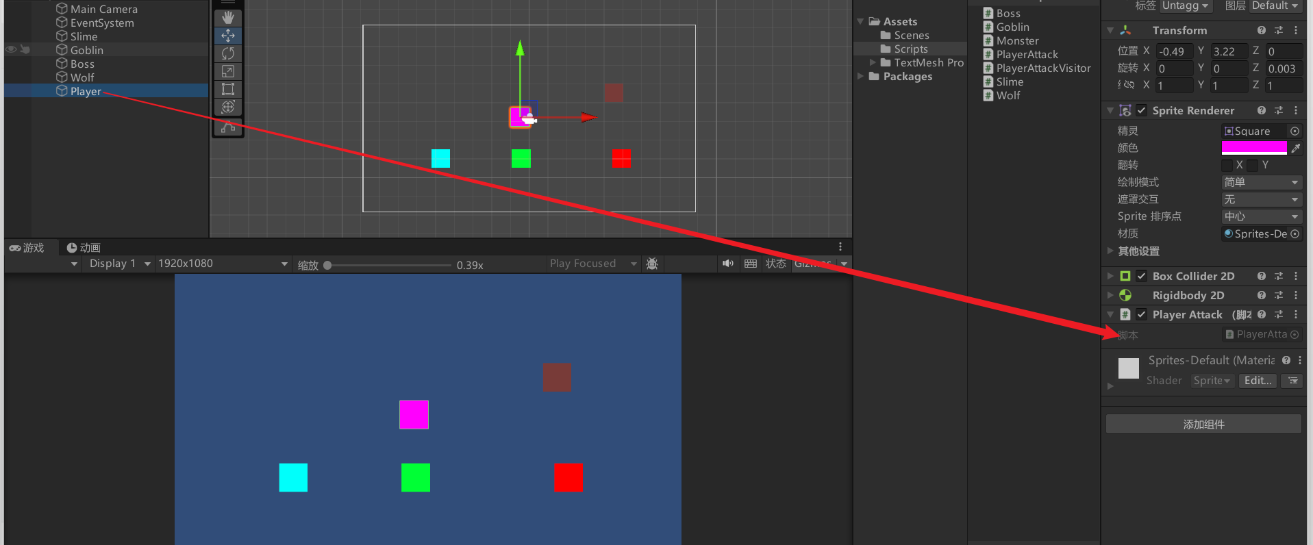 创建场景将玩家PlayerAttack加到玩家身上,并创建4个怪物,并且将怪物脚本加到对应怪物身上。