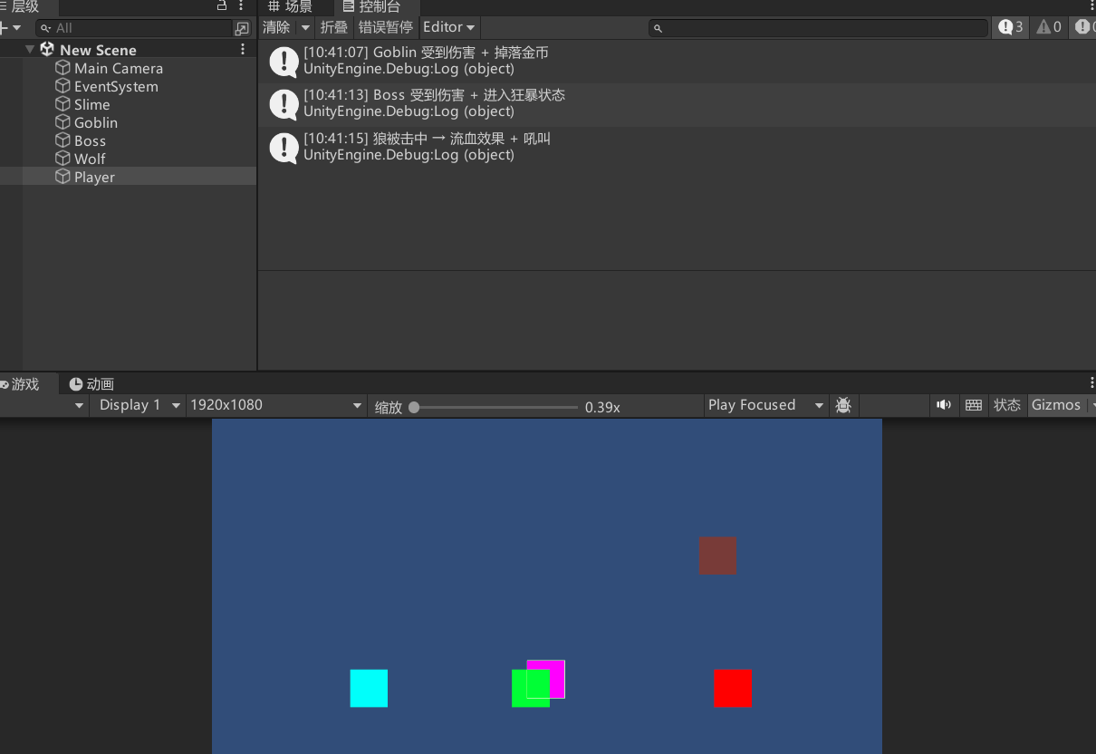 运行游戏拖动玩家,就会发现玩家碰撞到怪物执行了不同的方法