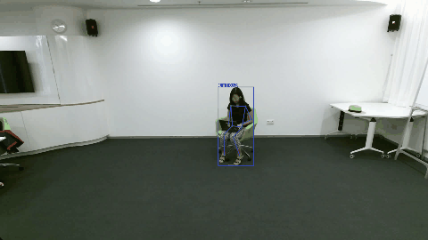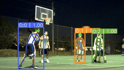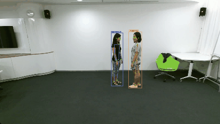 我们对检测框内进行了一次关键点提取(本质就是特征提取)。下图中,我在跟踪算法中引入关键点信息,通过关键点距离即可很简单地区分出两个跟踪ID (优化后,左边始终为蓝色,当然我们还可以引入更复杂的方式,比如加一个线性层编码之类的,来做更多优化)。