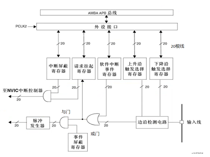 - 功能:STM32 中专门用来 "监测 GPIO 引脚电平变化" 的外设,是连接 GPIO 和中断系统的 "桥梁"。