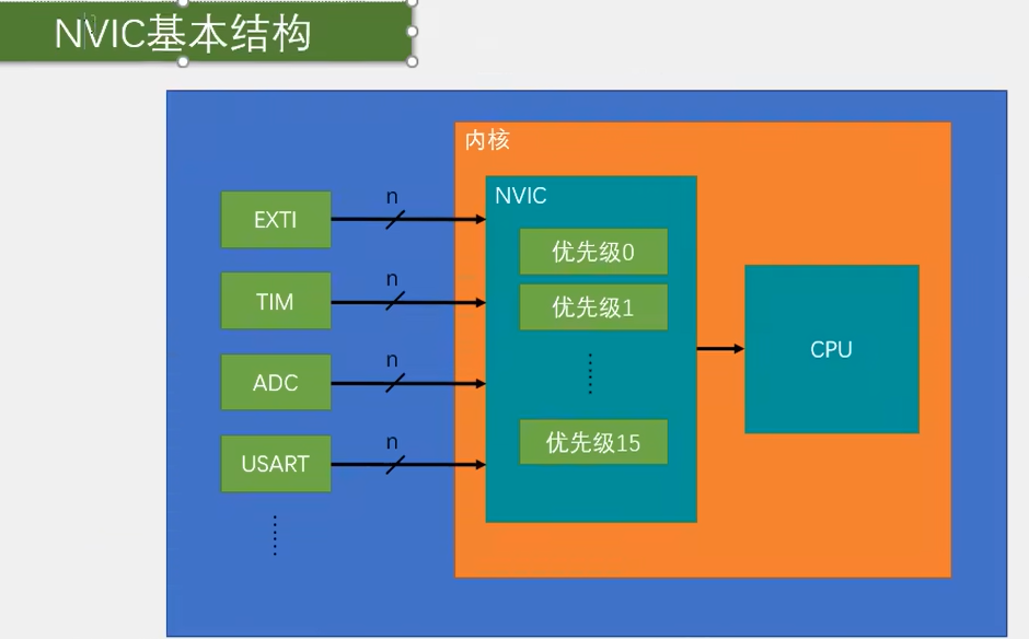 NVIC是嵌套中断向量控制器,作用就是管理这些中断外设,可以说的上cpu的小助手,右边只有一个输出口给CPU,它会根据优先级来判断是先进行哪一个。