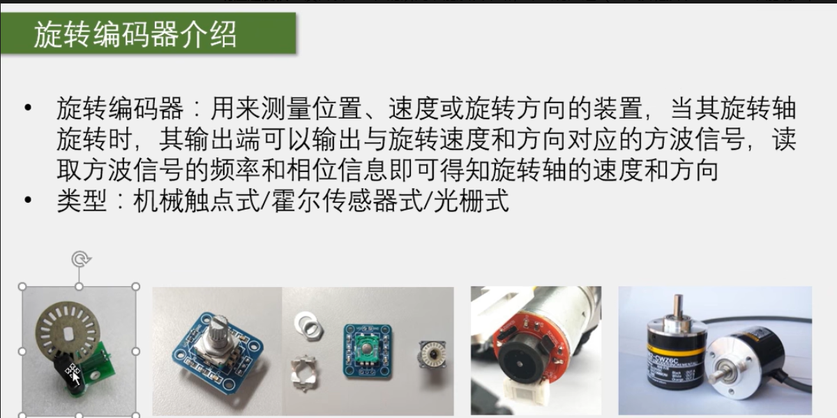 - 旋转编码器:用来测量位置、速度或旋转方向的装置,当其旋转轴旋转时,其输出端可以输出与旋转速度和方向对应的方波信号,读取方波信号的频率和相位信息即可得知旋转轴的速度和方向
