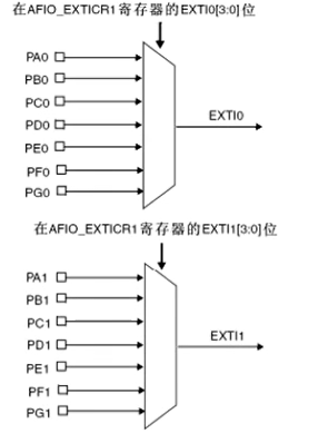 - 比如要让 EXTI0 中断监测 PB0 的电平变化,就需要通过 AFIO 设置 "EXTI0 通道关联 GPIOB 组";