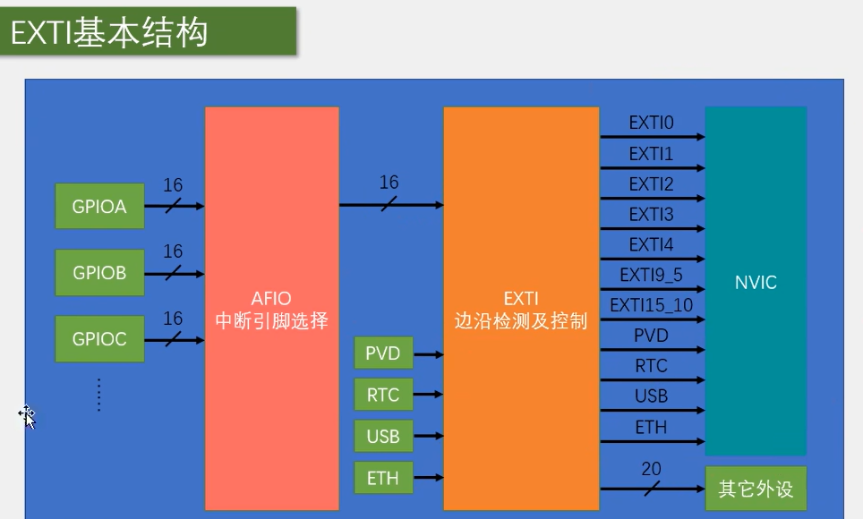 这里有许多GPIO的外设但是其中会经过AFIO中断引脚进行选择,其中比如GPIOA和GPIOB这两个外设如果有一个相同的pin比如是GPIOA_pin0和GPIOB_pin0那么AFIO就会进行选择然后决定让谁过去。然后经过EXTI的检测过后就会有16个引脚外加上下面的事件响应通道进入NVIC和其他外设中。