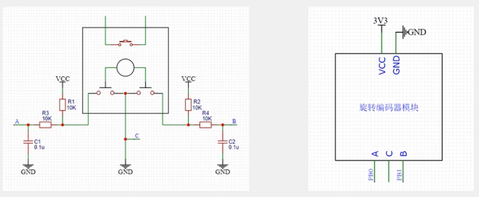 这是旋转编码器的硬件电路(左边是详细电路,右边是模块接线图),分两部分详细讲: