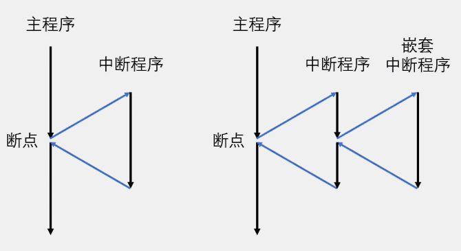 - 中断嵌套:当一个中断程序正在运行时,又有新的更高优先级的中断源申请中断,CPU 再次暂停当前中断程序,转而去处理新的中断程序,处理完成后依次进行返回