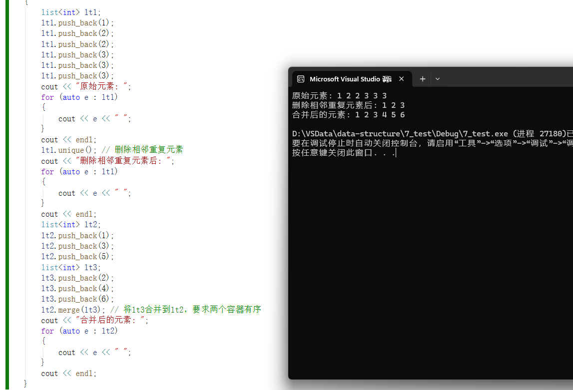 PS:容器当中被拼接到另一个容器的数据在原容器当中就不存在了。(实际上就是将链表当中的指定结点拼接到了另一个容器当中)