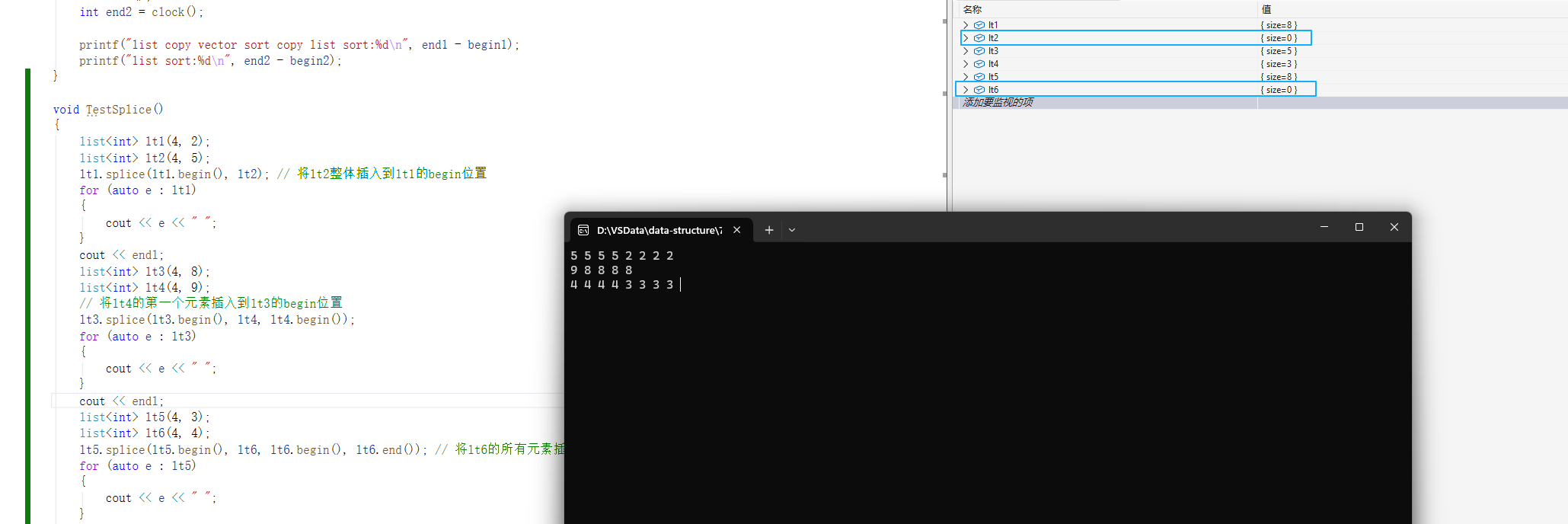 lt5.splice(lt5.begin(), lt6, lt6.begin(), lt6.end()); // 将lt6的所有元素插入到lt5的begin位置