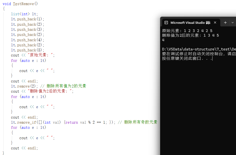 lt.remove_if([](int val) {return val % 2 == 1; }); // 删除所有奇数元素