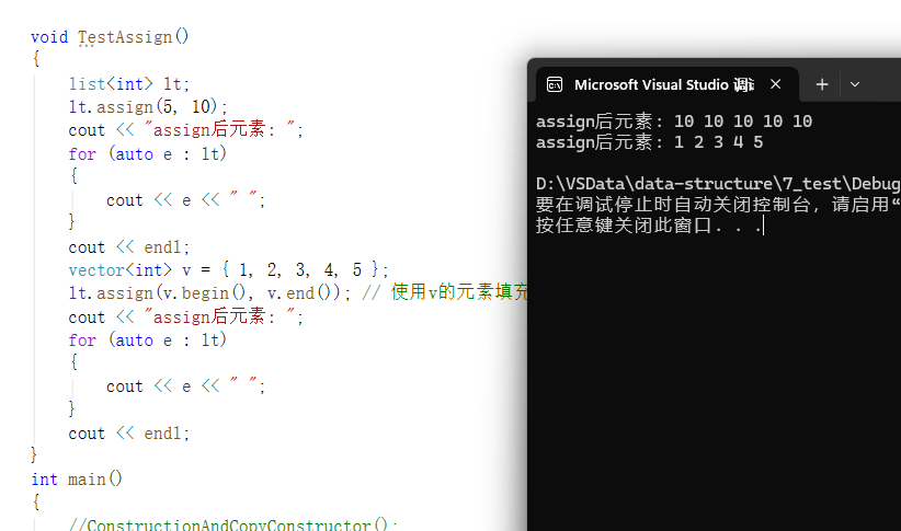 lt.assign(v.begin(), v.end()); // 使用v的元素填充容器