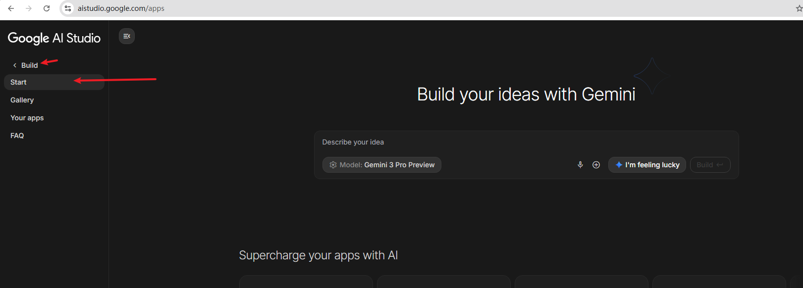 1.进入Gemini3官方网址:https://aistudio.google.com/apps,打开对话框Build→Start
