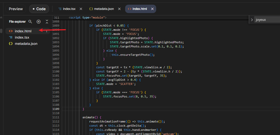Pinch (捏合): Math.hypot(thumb - index) < 0.05 -> 触发 FOCUS 模式。