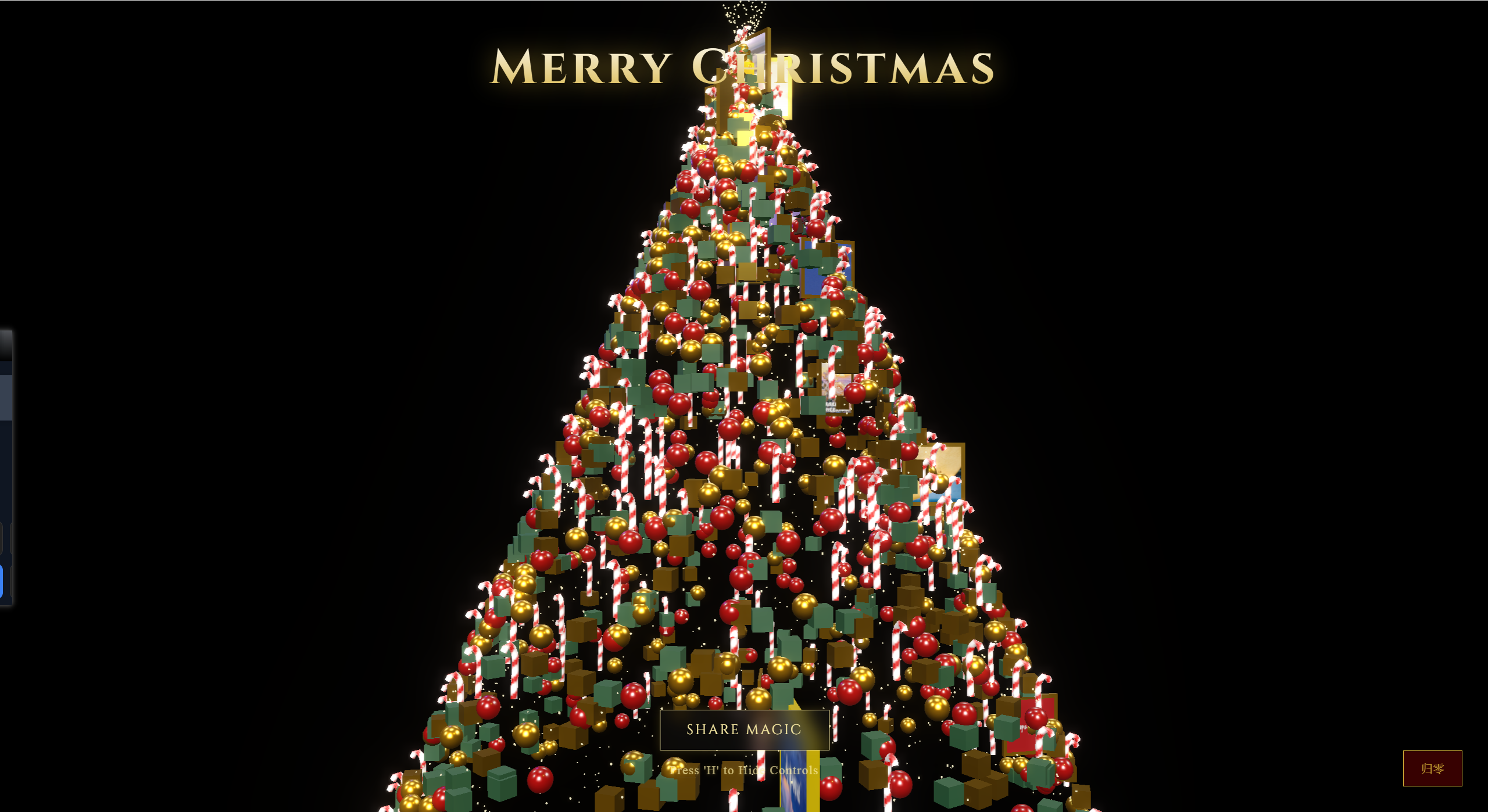 标题: 顶部居中 <h1> "Merry Christmas",字号 56px,使用 CSS linear-gradient (白到金) 实现文字渐变色,并加辉光阴影。