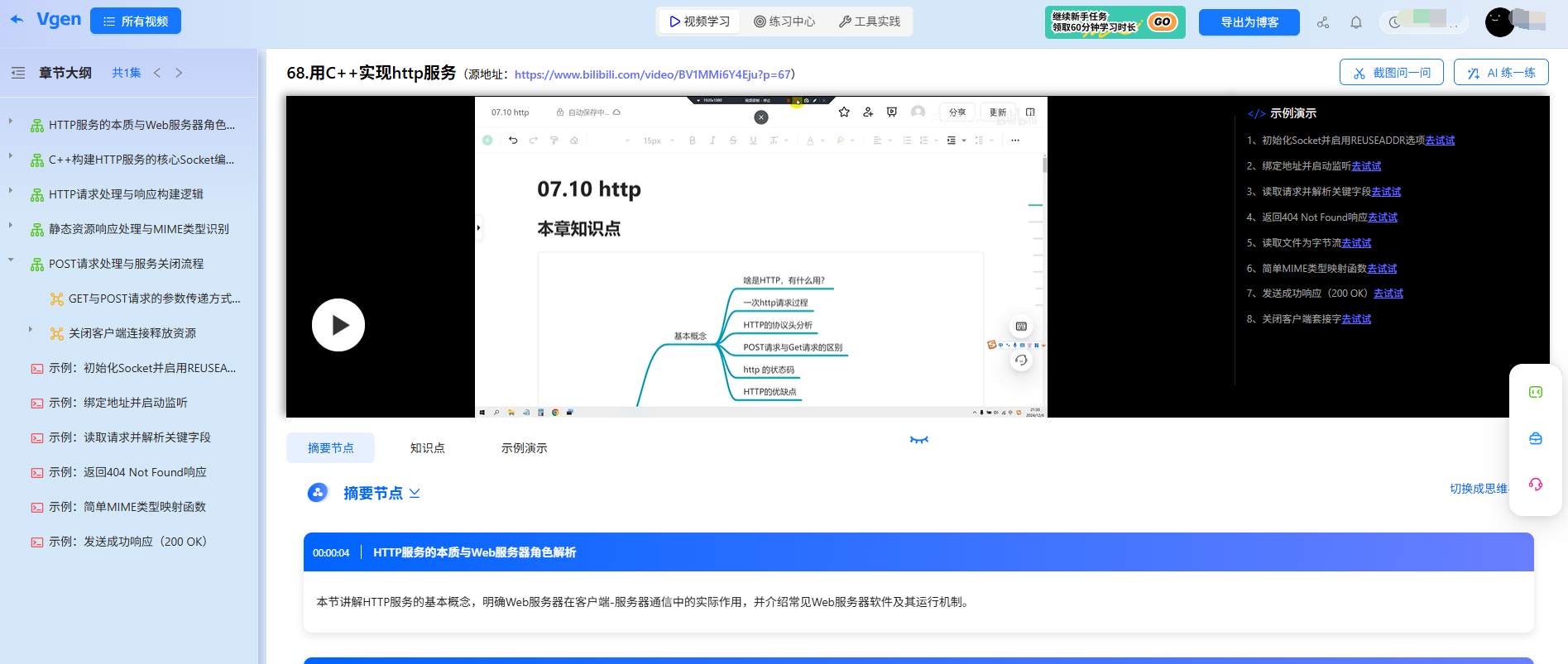 我是借助AI工具,把视频内容按"HTTP协议基础→TCP网络编程→服务端实现→避坑指南"的逻辑,把40分钟视频浓缩成清晰的知识框架,甚至生成思维导图,每个节点都标注视频对应时间戳,不用记笔记也能串起"协议→代码→功能"的完整链路。