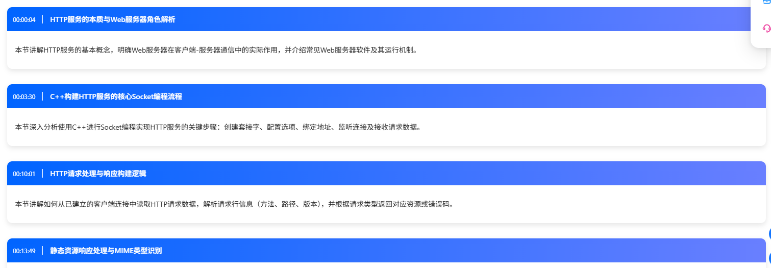 用C++实现HTTP服务,核心是"HTTP协议解析+TCP网络编程+服务端逻辑封装"的三重结合。但视频"快节奏协议讲解+高密度代码演示"的模式,对新手来说往往是"知其然,不知其所以然":