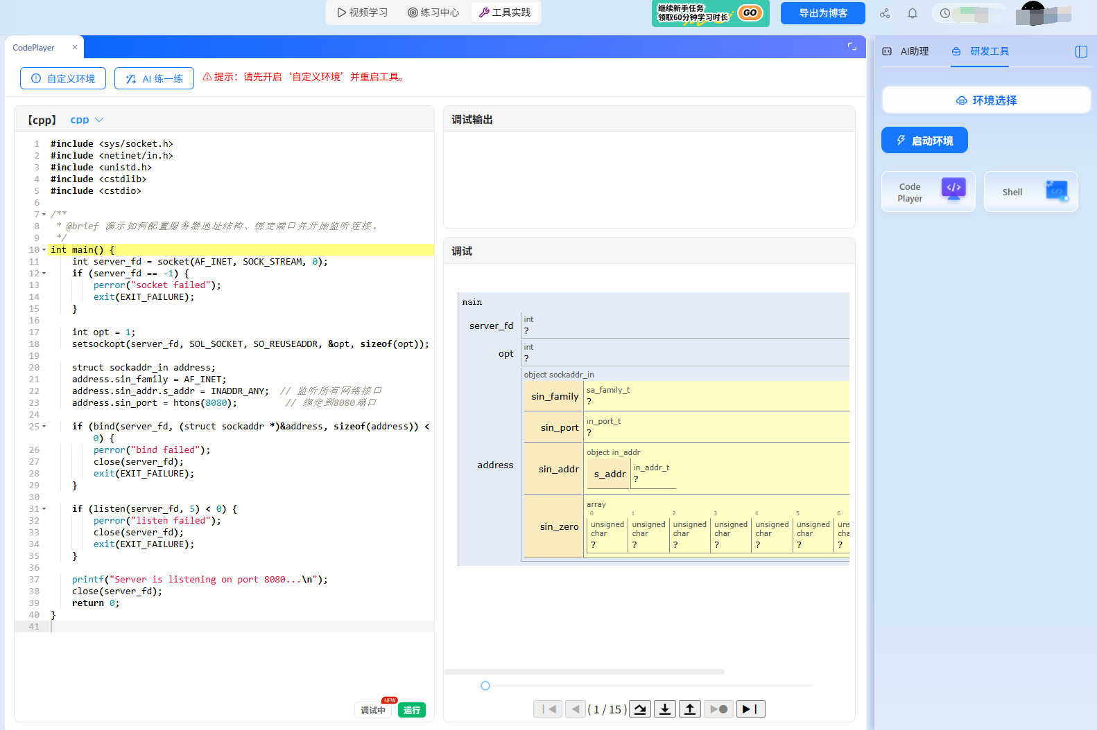 本地环境的"库依赖多、跨平台差异大、编译参数复杂",在AI学习助理的在线沙盒预装了Windows/Linux双环境的编译依赖(Winsock、socket、libcurl),提供视频里的所有测试代码,不用在本地折腾,直接写代码、改逻辑、看效果,实时反馈报错原因和解决方案。