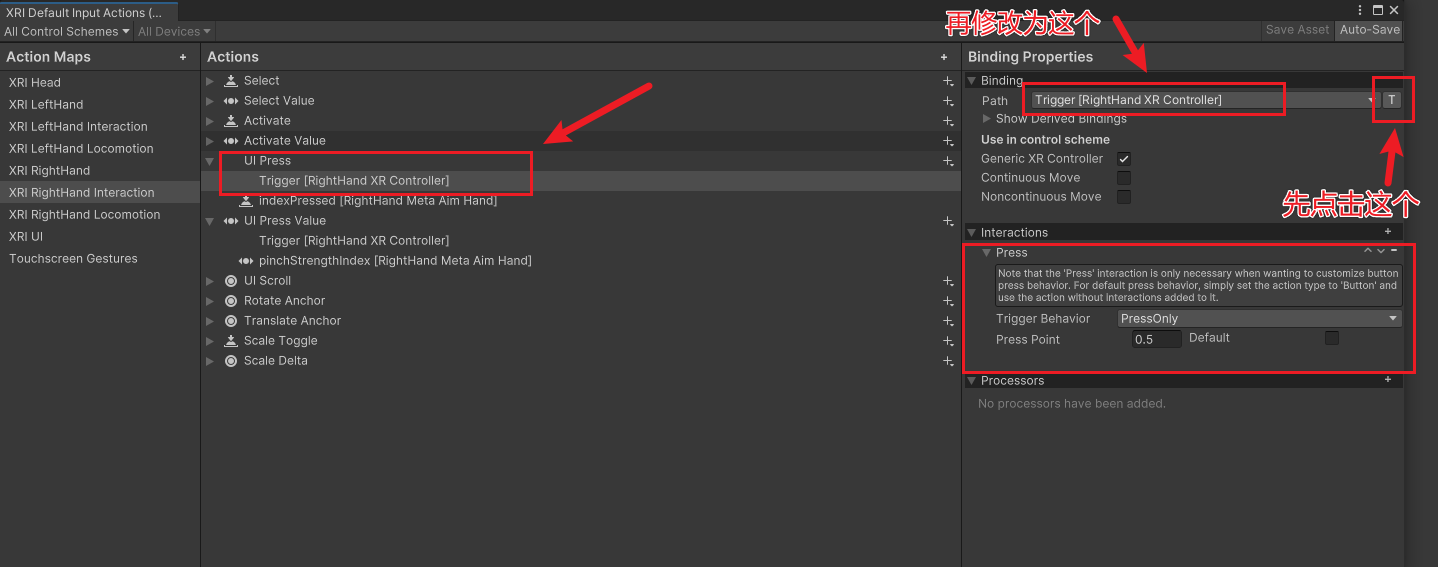 Path: TriggerButton [RightHand XR Controller] Action Type: Button Interaction: Press (Press Point = 0.1)