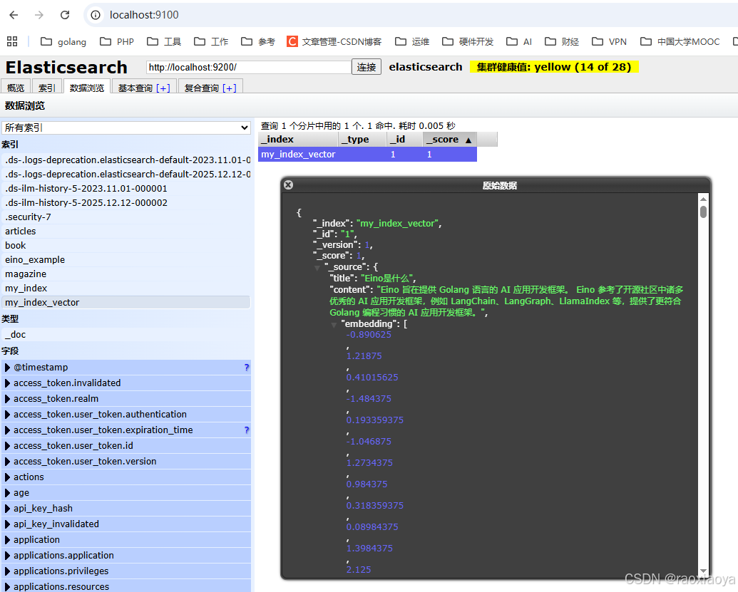 还需要特别注意的是 embedding 维度要匹配,elasticsearch中的dense_vector类型,在版本8.0 -- 8.11中,默认的最高维度是2048,在 **8.12+**之后是4096,当然,这个值越高计算越慢。数据的维度必须小于es能存储的维度,否则会报错。