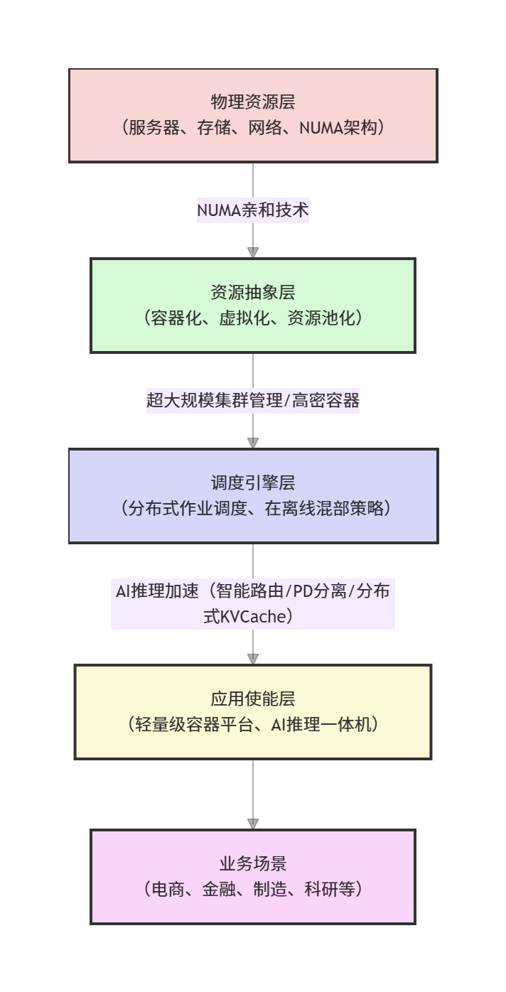 - 资源抽象层:核心作用是将物理资源进行池化与虚拟化,消除硬件差异带来的适配难题。通过NUMA亲和调度模块实现进程与内存的拓扑优化,高密容器引擎提升资源利用率,虚拟化管理模块支持多种虚拟化技术,资源监控采集模块则为调度决策提供实时数据支撑。