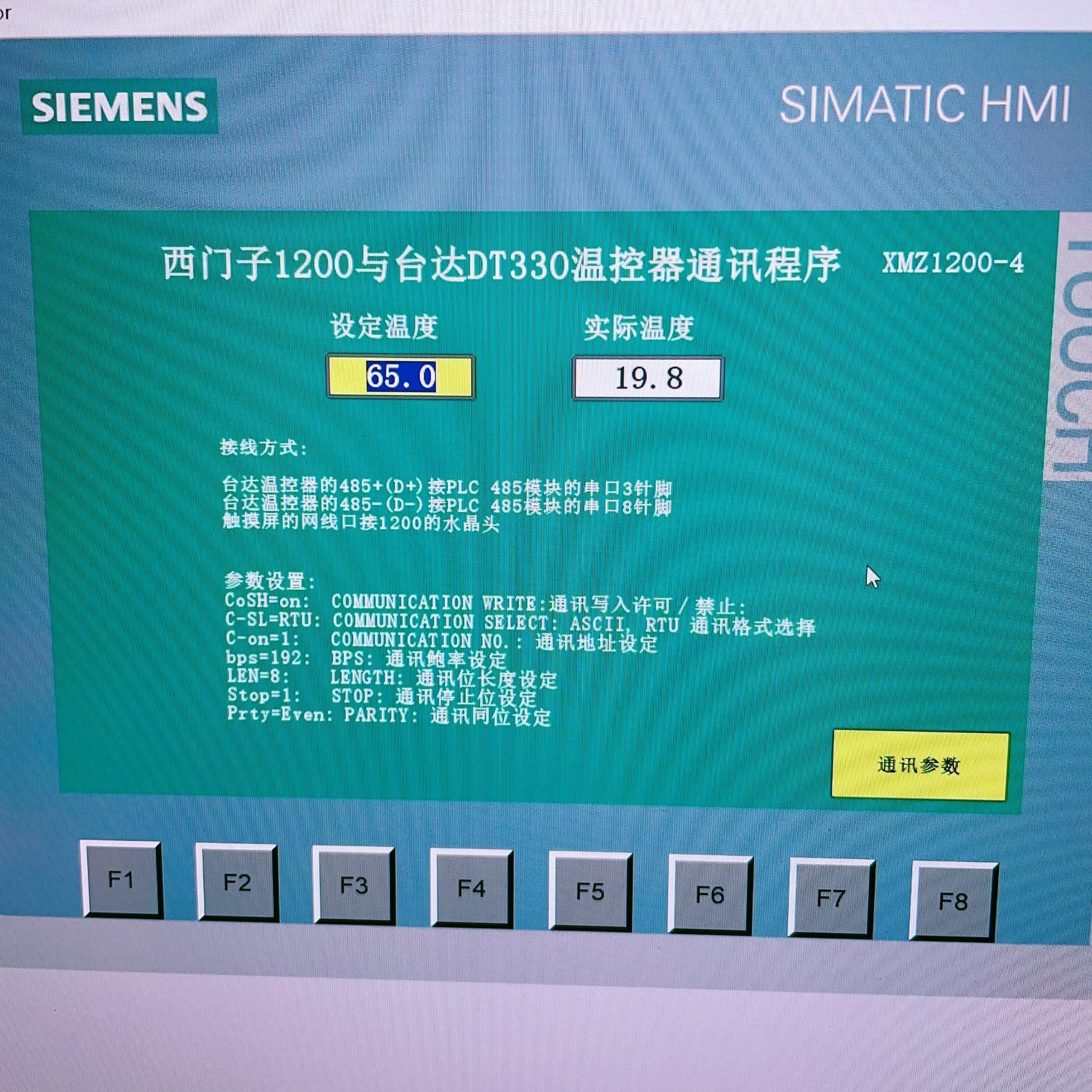 西门子1200与台达DT330温控器通讯程序(XMZ1200-4) 功能:实现西门子1200 PLC对台达DT330温控器进行485通讯控制,在触摸屏上设定温度,读取温度 器件:西门子1200 1214DC/DC/DC.昆仑通态TPC7022NI,西门子KTP700 Basic PN,台达DT330温控器。 说明:的是带详细注释西门子触摸屏PLC设置和温控器设置,接线说明书。 附送昆仑通态触摸屏程序