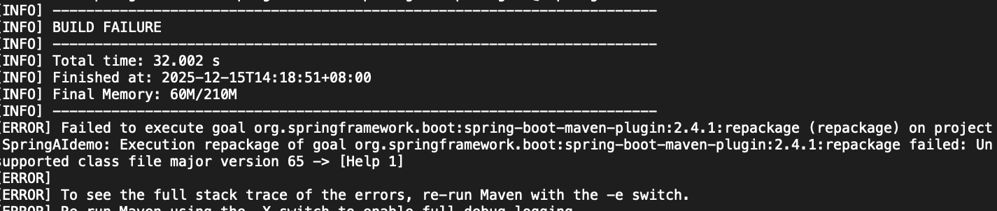问题一: 接入SpringAI需要将JDK升级到17+,这里直接升级JDK21后报错"run failed: Unsupported class file major version 65"