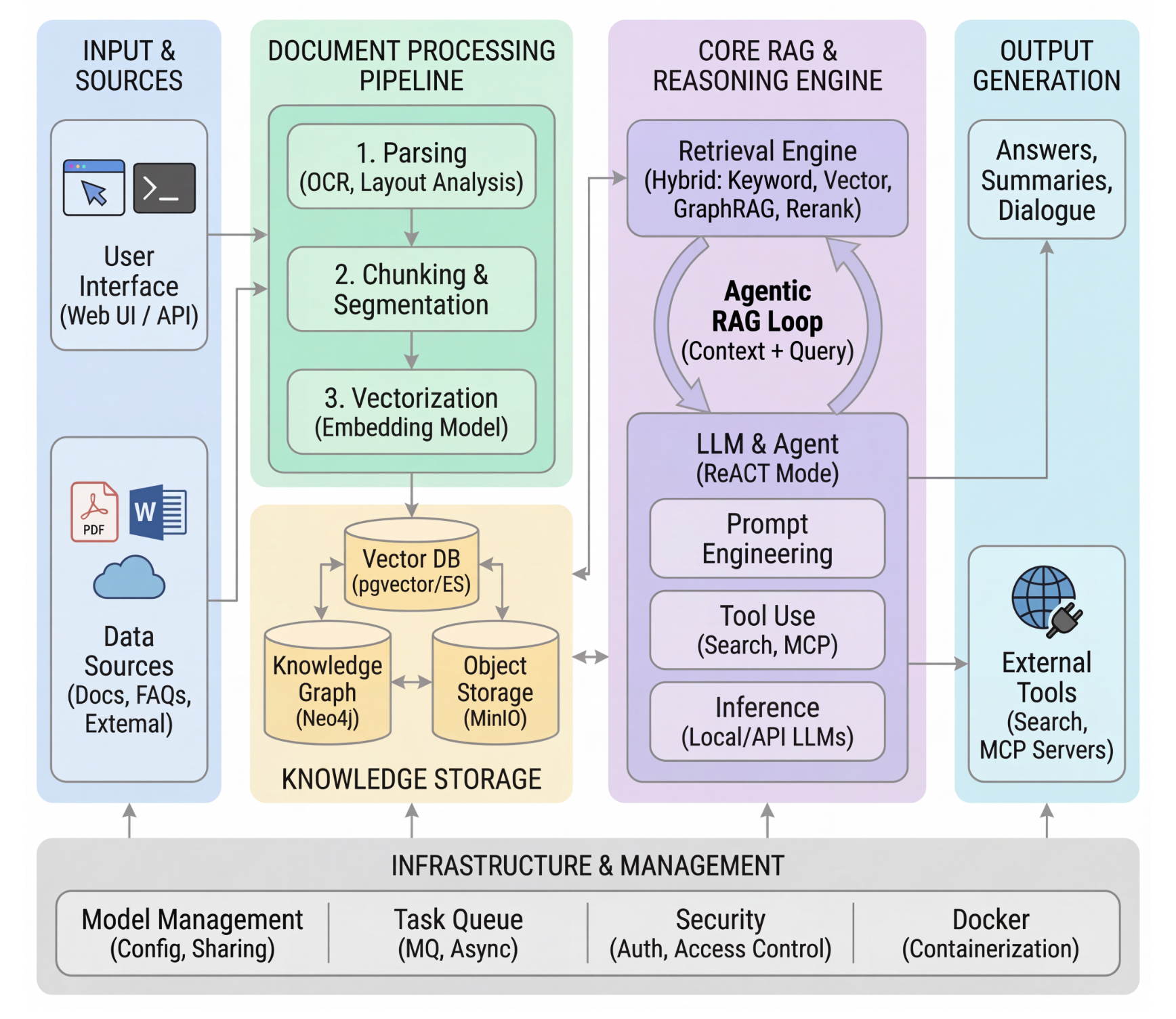任务管理采用MQ异步机制,文档解析、向量化等耗时操作会在后台异步执行,避免用户等待;