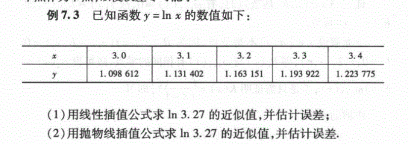 已知数据表:给出了 x x x 从 3.0 到 3.4 的五个点,以及对应的精确函数值 y y y(保留了6位小数)。