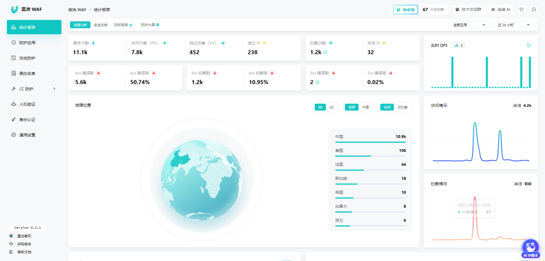 多维能力拓展,适配全栈业务场景:雷池社区版集成了 CC 攻击防护、恶意 IP 情报拦截、一键强制 HTTPS、人机验证等多维功能,完美适配全栈时代的业务安全需求。